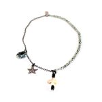 Handmade boho necklace, that consists of yellow wooden bead, bronze embellishments and filigree, yellow and brown disk-shaped wooden pendants, on yellow leather string with green silk tassel.