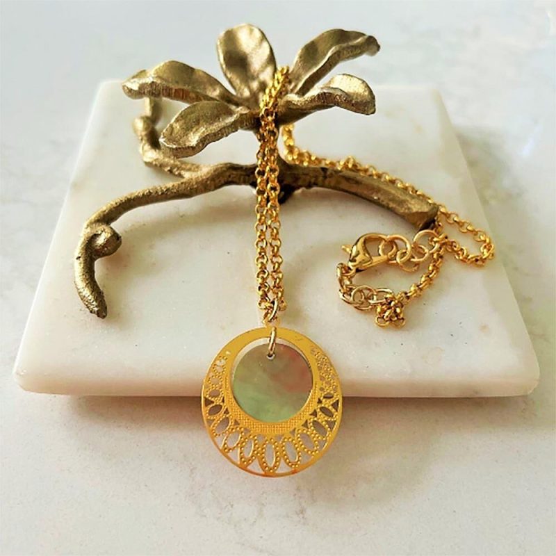 Handmade boho necklace with a bronze light green interlocking-circles laser-cut mussel-shell pendant hanging from a gold-plated cable chain with delicately small links and lobster claw clasp.